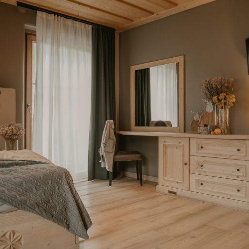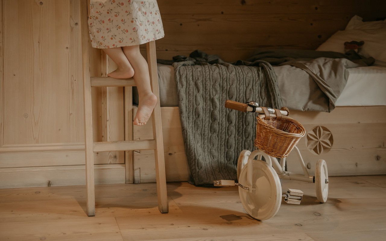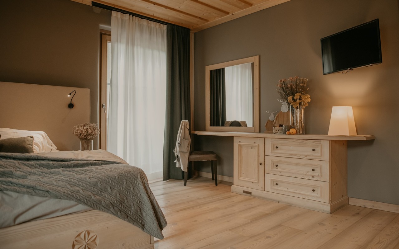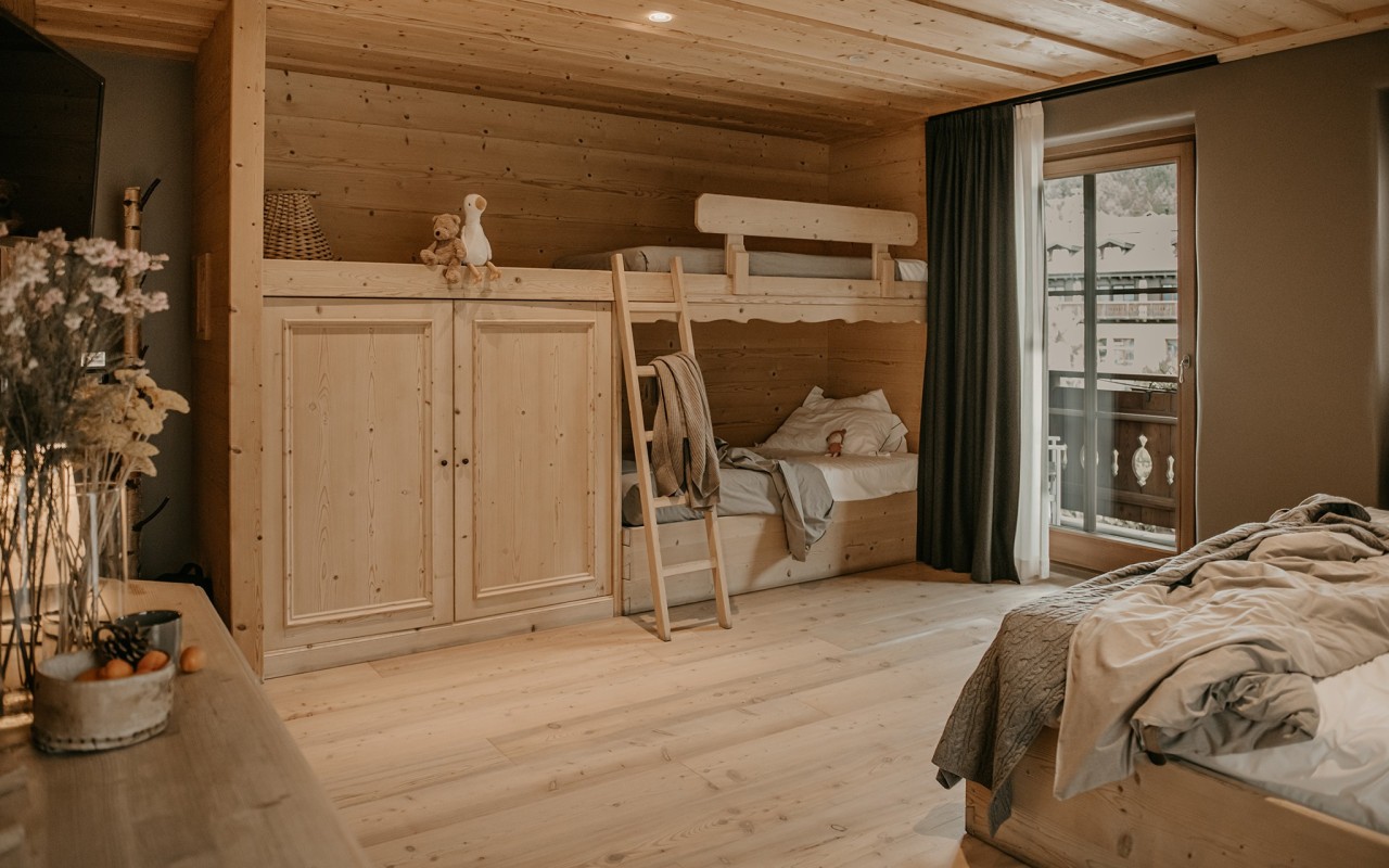 La camera Family dell'Agriturismo Rini è una spaziosa quadrupla con letto matrimoniale e letto a castello, due balconi per godersi i panorami mozzafiato delle montagne di Bormio, e scrivania.
