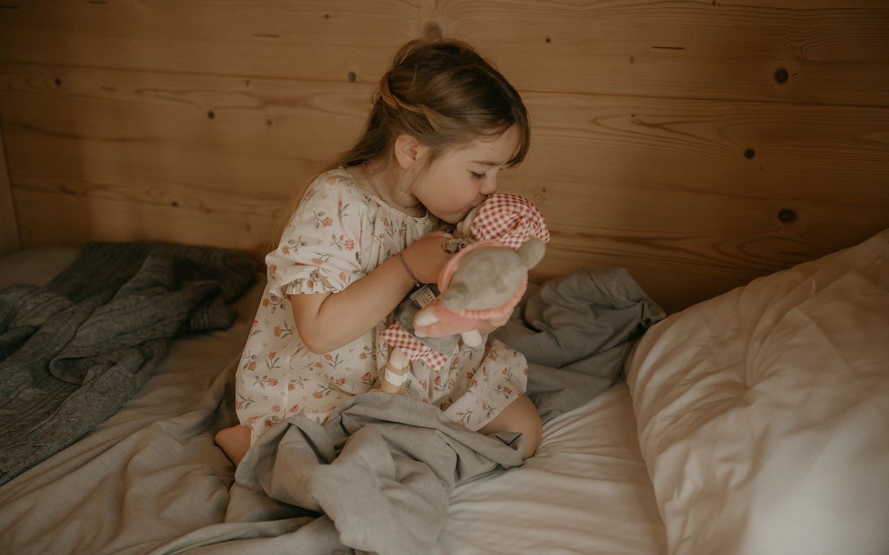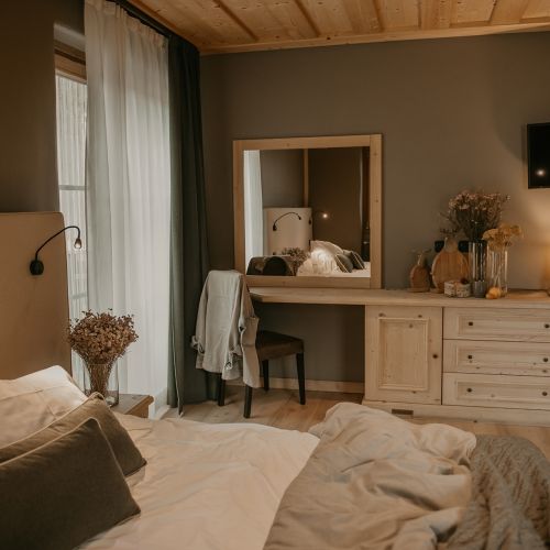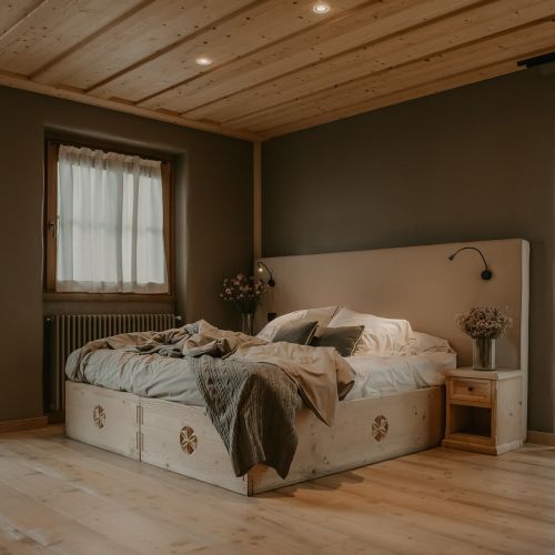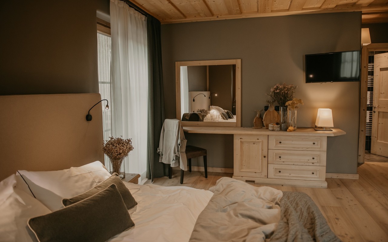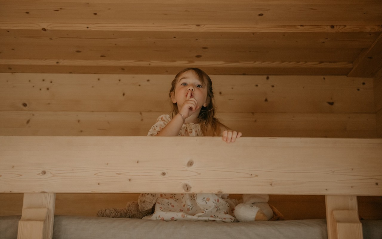 La camera Family dell'Agriturismo Rini è una spaziosa quadrupla con letto matrimoniale e letto a castello, due balconi per godersi i panorami mozzafiato delle montagne di Bormio, e scrivania.